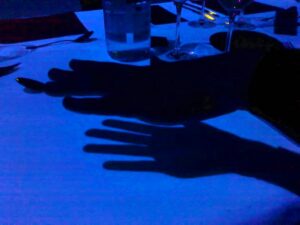 Dłoń Moniki nad skąpanym w niebieskim świetle futurystycznym stołem w Radialsystem V. Fot. Dorota Kozińska