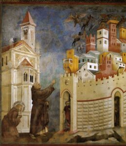 Giotto di Bondone (?), Wypędzenie demonów z Arezzo, 1297-99. Fresk z górnego kościoła Bazyliki św. Franciszka w Asyżu