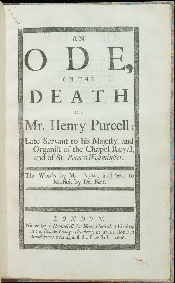 Zanim jednak do tego doszło, Anglia pogrążyła się w żałobie po Purcellu. Muzyczne elegie na jego śmierć wyszły spod pióra wielu prominentnych twórców, między innymi Jeremiaha Clarke’a i Gottfrieda Fingera. Najintymniejszy, a zarazem najgłębiej przemyślany hołd złożyli mu jednak Dryden oraz John Blow, nauczyciel i bliski przyjaciel kompozytora – w postaci An Ode on the Death of Mr. Henry Purcell na dwa kontratenory (co w ówczesnej praktyce wykonawczej oznaczało zapewne dwa wysokie tenory), dwa „żałobne” flety proste i basso continuo.