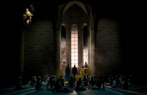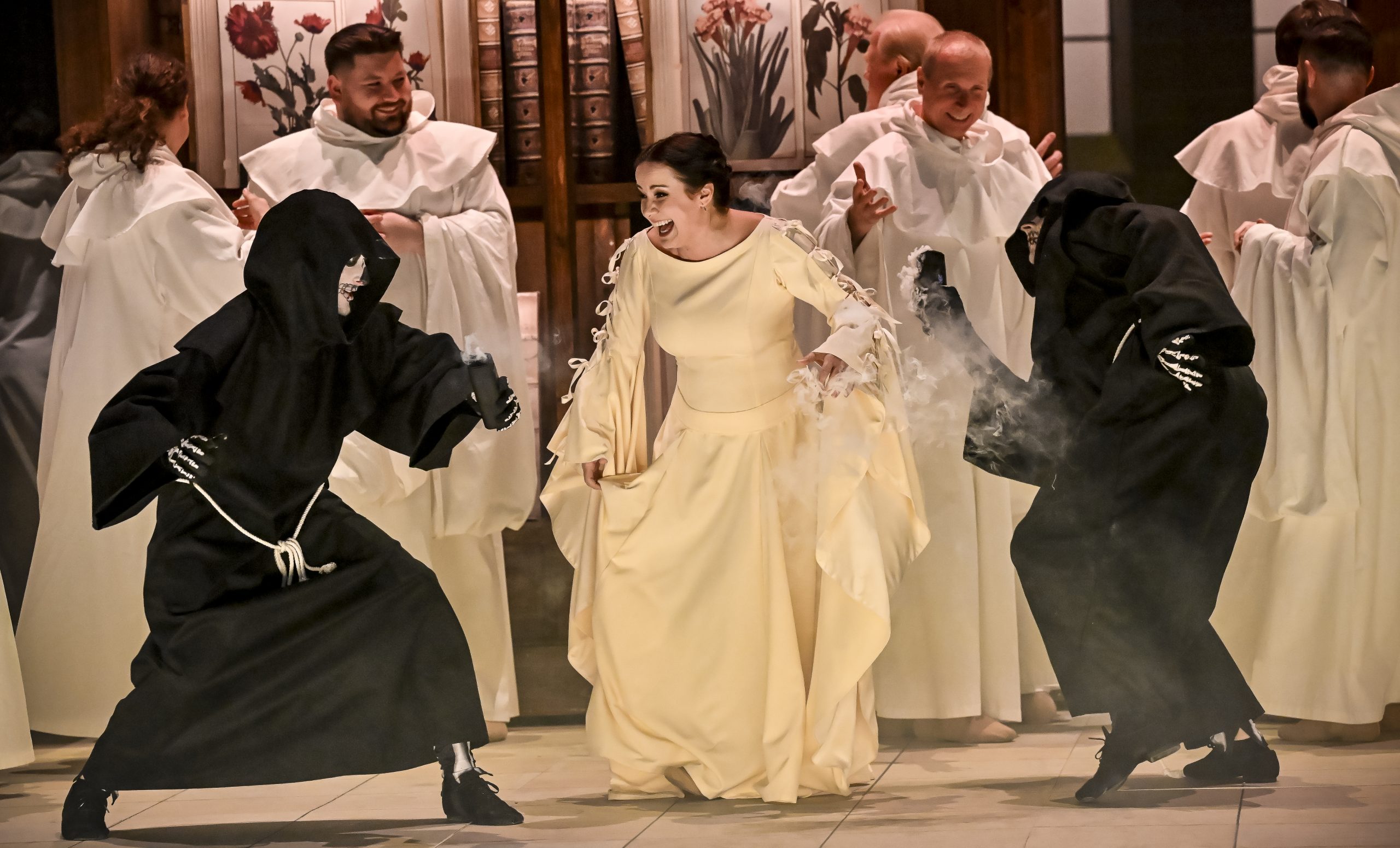 Im bardziej w nas narastało poczucie absurdu, tym łatwiej nam było skleić narrację w przekonującą całość – a to za sprawą brawurowej roboty reżyserskiej Heřmana, który podszedł do Czarciej ściany z rozmachem godnym Salle le Peletier w czasach Meyerbeera. I z podobnym poczuciem humoru, jakie musiało cechować realizatorów efektów specjalnych we francuskich grand opéras. Heřman po mistrzowsku wykorzystuje efekt „obcości” pojedynczego detalu bądź rekwizytu – średniowieczny sztafaż (świetne kostiumy Zuzany Štefunkovej Rusínovej) zaburzy młody mnich w trampkach, kilka razy na scenę wjadą taczki z marketu budowlanego, a chłopki będą popychać grabiami schludnie sprasowane bele słomy. Reżyser prowadzi też przekomiczną grę z symbolami. Wielka obfitość ryb, łowionych w kanale orkiestrowym i pływających w spiętrzonej Wełtawie, na końcu zaś karp machający ogonem w objęciach gotyckiej rzeźby, przypomina dyskretnie (?), że Vyšší Brod jest opactwem cysterskim. Heraldyczna róża Rożemberków pojawia się w różnych kontekstach – między innymi w uroczystym entrée Voka Vítkovica w pełnej zbroi (nie opiszę tej sceny, bo jeśli ktoś ma zamiar się wybrać do Brna, popsuję mu całą zabawę).