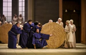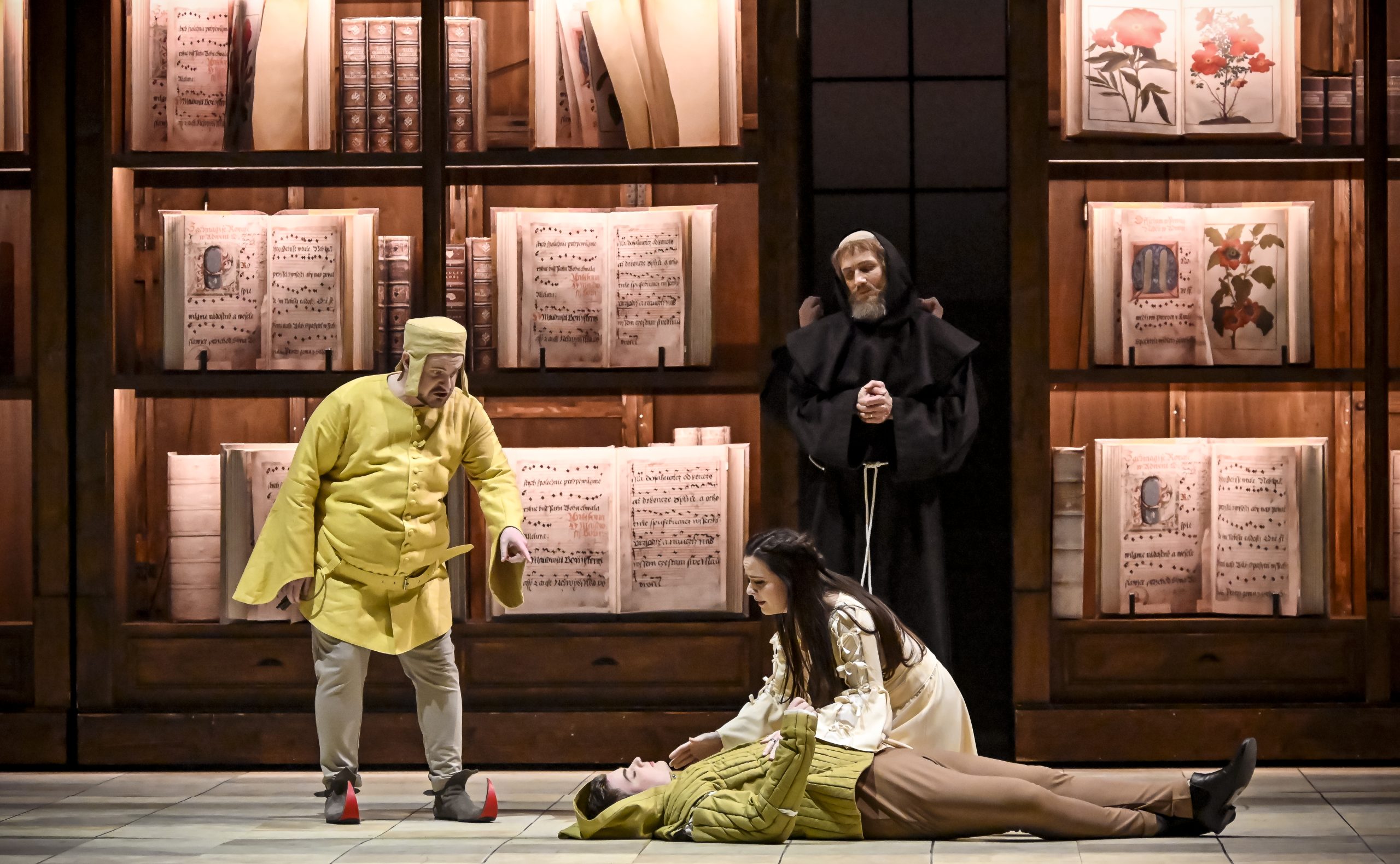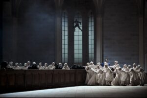 The more our sense of the absurd grew, the easier it was to turn the narrative into a convincing whole – thanks to the brilliant direction of Heřman, who approached The Devil’s Wall with a panache worthy of the Salle le Peletier in Meyerbeer’s era. And with a sense of humour similar to that which must have characterised the authors of special effects of the French grand opéras. Heřman masterfully exploits the “alienness” of a detail or prop – the medieval setting (Zuzana Štefunková Rusínová’s superb costumes) is disrupted by a young monk in trainers; wheelbarrows from a DIY store roll onto the stage several times, and the peasant women push quite modern, neatly compressed bales of straw with their rakes. In addition, the director plays a hilarious game with symbols. The abundance of fish caught in the orchestra pit and swimming in the banked up Vltava, and, finally, the carp wagging its tail in a Gothic sculpture’s arms serve as a subtle (?) reminder that Vyšší Brod is a Cistercian abbey. The Rožmberks’ heraldic rose appears in a variety of contexts – for example, in Vok Vítkovic’s ceremonious entrée in full armour (I will not describe the scene, for if anyone is intending to go to Brno, I will spoil all the fun for them).
